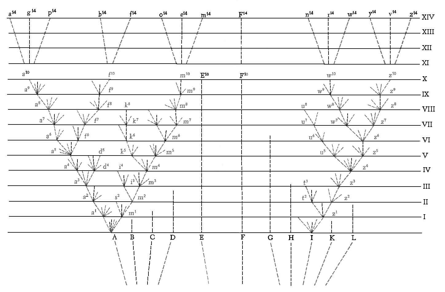 gli esseri non come creazioni speciali, ma come i discendenti diretti di pochi